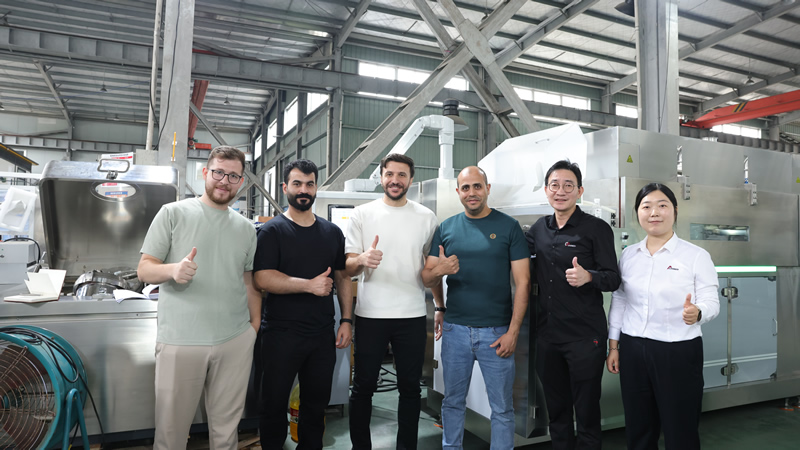 踏入齐蓁科技的生产车间,里面一派繁忙景象。在车间的一端,来自约旦一制药企业的项目负责人阿拉及其团队成员,正在验收一套口腔崩解膜制药机械设备。他们仔细检查设备的外观、功能以及各项技术指标,并认真记录相关数据。