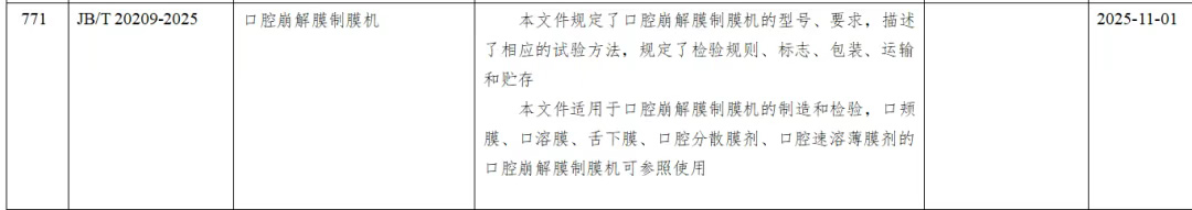 口腔崩解膜制膜机》标准明确规定了该设备的型号、要求,详细描述了相应试验方法,并对检验规则、标志、包装、运输和贮存等环节作出规范,适用于口腔崩解膜制膜机的制造与检验,同时口颊膜、口溶膜等相关口腔崩解膜制膜机也可参照使用。
